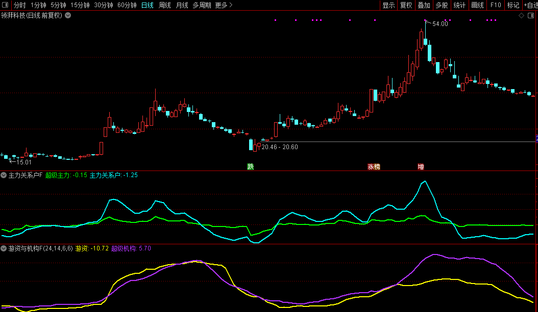 主力关系户线(青色):监测短期资金联动,灵敏度更高。