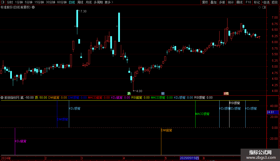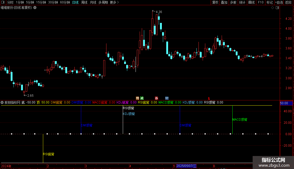 RSI顶背:IF(D3>0,50,0),COLORFFFFFF,POINTDOT;