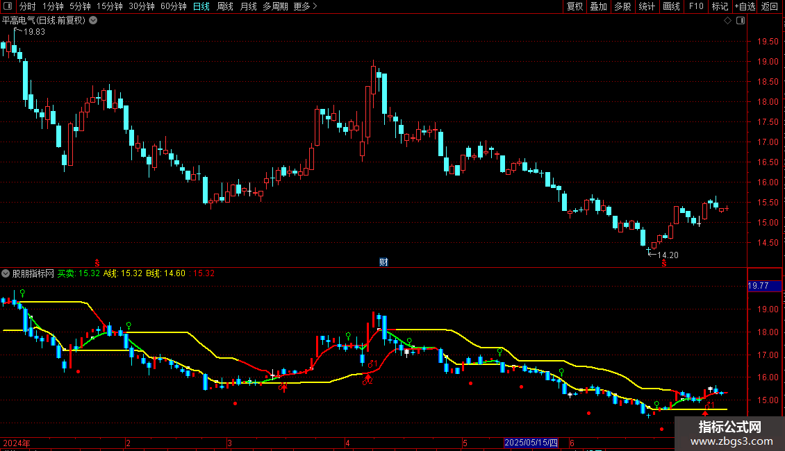 DRAWTEXT(COUNT(日平>=0 AND 周平>=0,5)=1 AND 日平>=0 AND 周平>=0,L*0.96,'♂2')COLORRED;