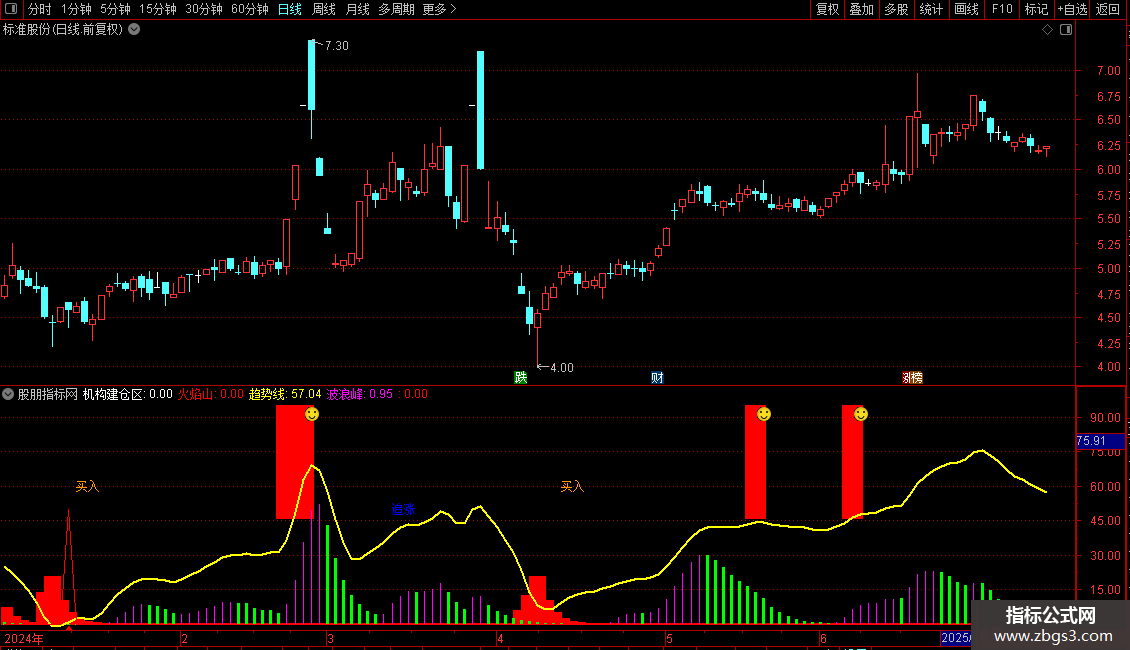 火焰山:EMA(IF(LOW<=VAR7 AND 趋势<40,(VAR11+VAR12),0),3)/618,COLORRED,LINETHICK2;