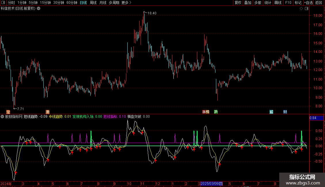 短线指标:IF(((((CROSS(短线趋势,中线趋势) AND (短线趋势 < 0)) AND (中线趋势 < (0 - 0.2)+4)) AND (VAR11 > 45)) AND (VAR16 > 0)),0.4,0.1),COLORMAGENTA;