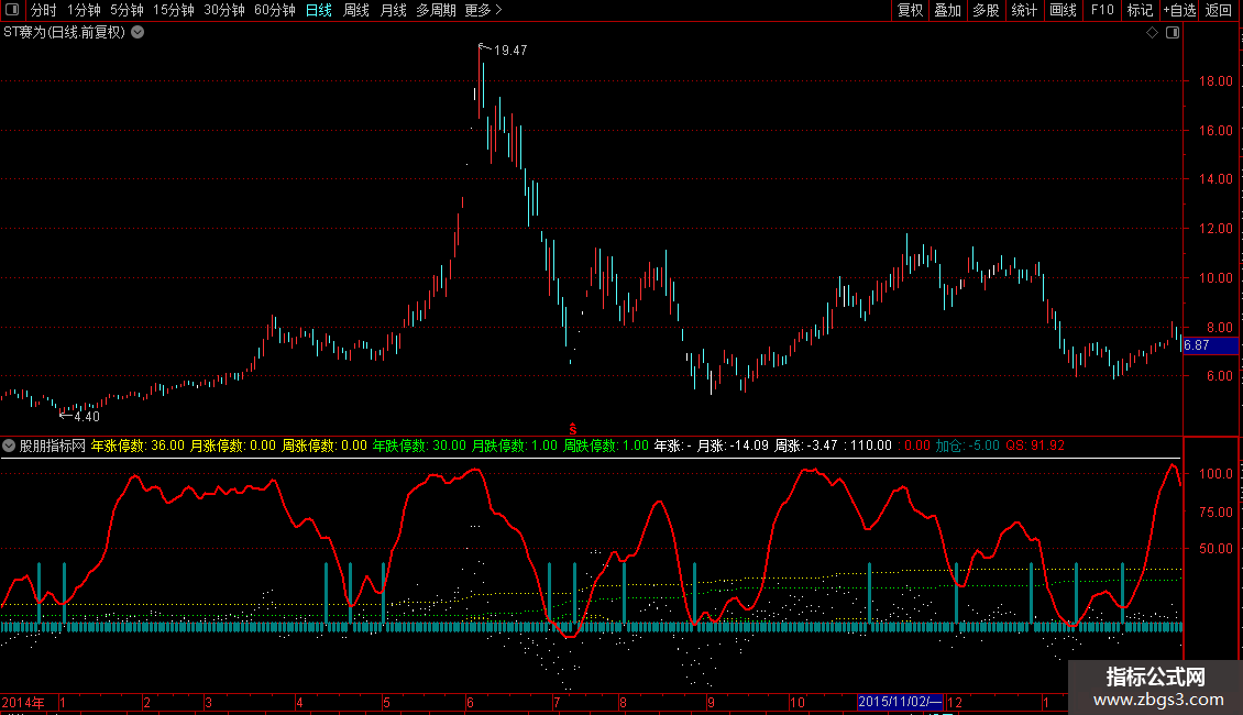 年涨: (CLOSE-REF(C,YEAR))/REF(C,YEAR)*100,POINTDOT,COLORWHITE;