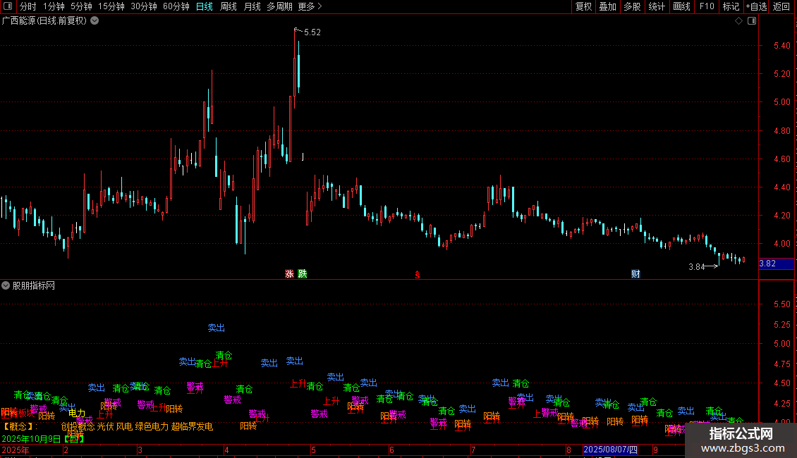 DRAWTEXT(FILTER(清仓信号=1,3),H*1.02,'清仓'),COLOR00FF00;