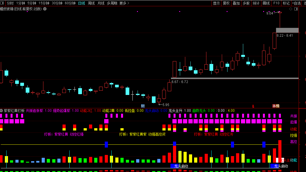 高级打板"紫紫红黄紫"副图本指标是个股动能、资金、控盘、起爆全方位综合在一起的一个最新改进型游资指标。