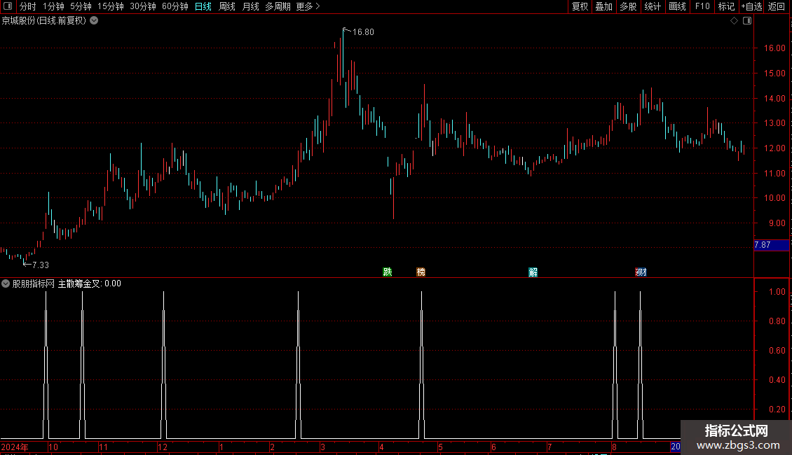 散筹估算:=EMA((WINNER(C*1.1)-WINNER(C*0.9))*70,3),LINETHICK3,COLORFFFF00;主筹估算:=EMA(WINNER(C)*70,3),LINETHICK3,COLORRED;筹码锁定:=散筹估算-主筹估算,COLOR66FF00,LINETHICK2;主散筹金叉:crOSS(主筹估算,散筹估算),COLORWHITE;