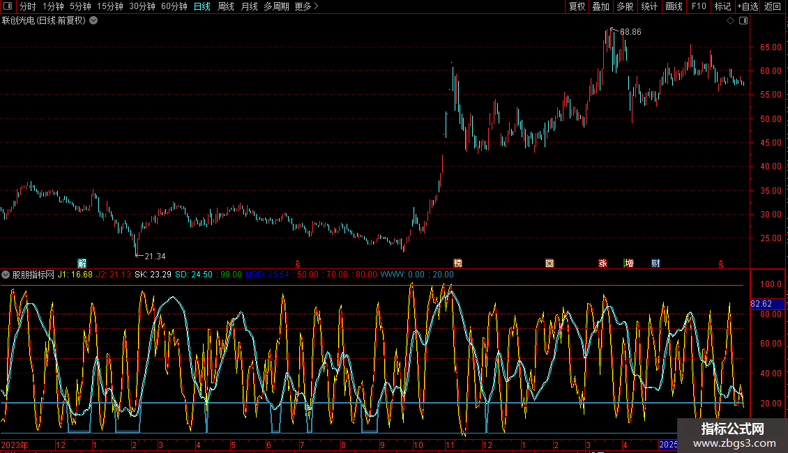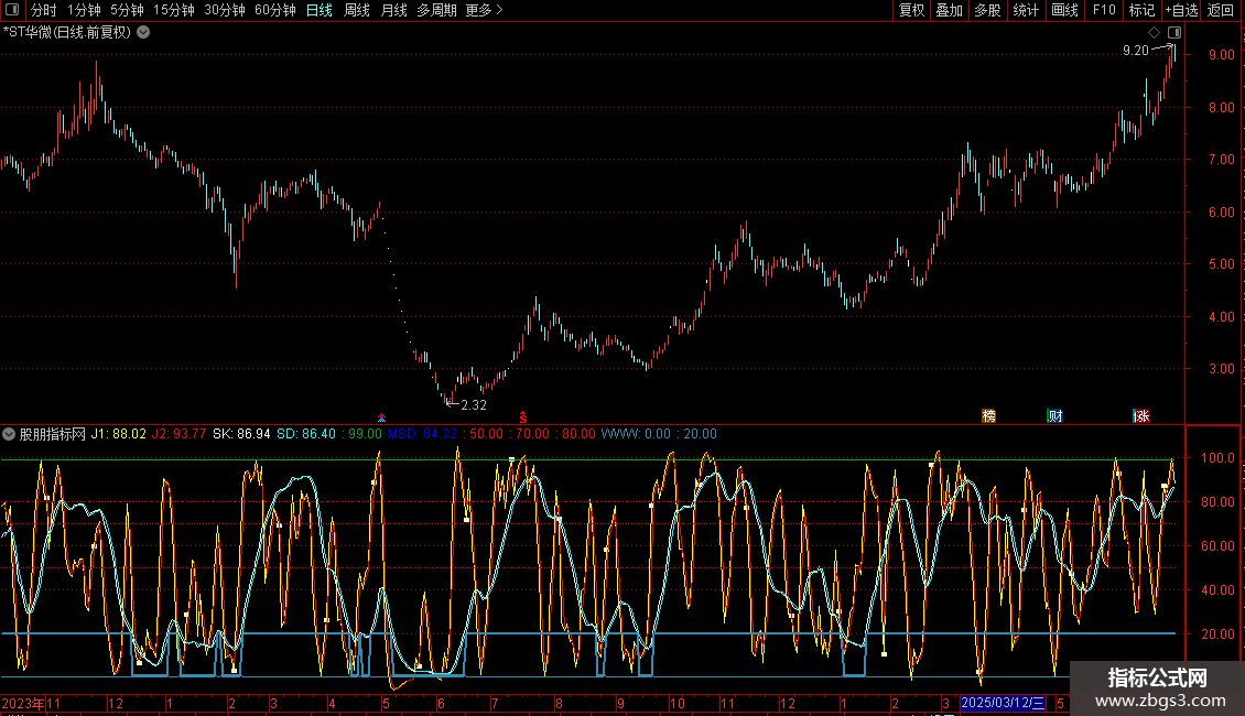 SD: EMA(0.667*REF(SK,1)+0.333*SK,1),COLORCYAN,LINETHICK1;