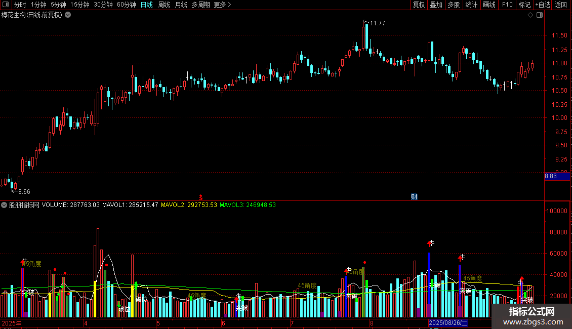 以下是对趋势量能突破指标的全面解析及操作策略,结合代码中的信号逻辑和图形标记进行说明: