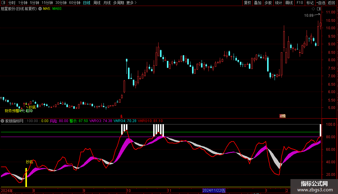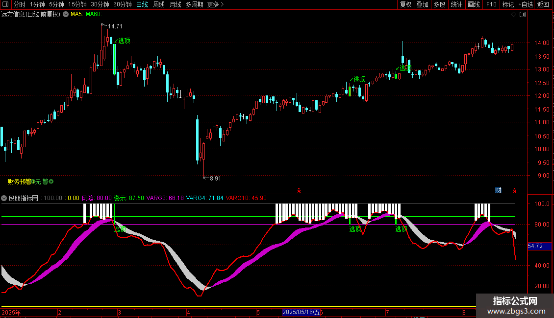 指标通过36日高低点计算股价相对位置,用三条信号线(紫、黄、蓝)判断买卖点。当紫线上穿黄线且处于低位时显示“抄底”信号(黄色柱状提示),适合逢低买入;当黄线下穿紫线且处于高位时显示“逃顶”信号(绿色柱状提示),建议分批减仓。风险线(80)和警示线(87.5)区域用彩色带标记,超买时需警惕回调。操作上,抄底信号出现可轻仓试多,逃顶信号出现应逐步止盈,结合成交量验证更稳妥。