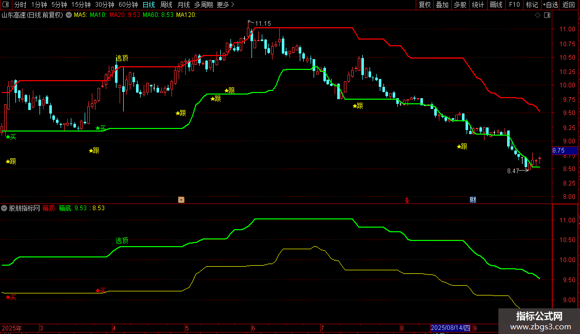 DRAWTEXT(CROSS(买线,卖线)AND 箱顶>=REF(箱顶,1),LOW*0.95,'★跟'),COLOR00FFFF;