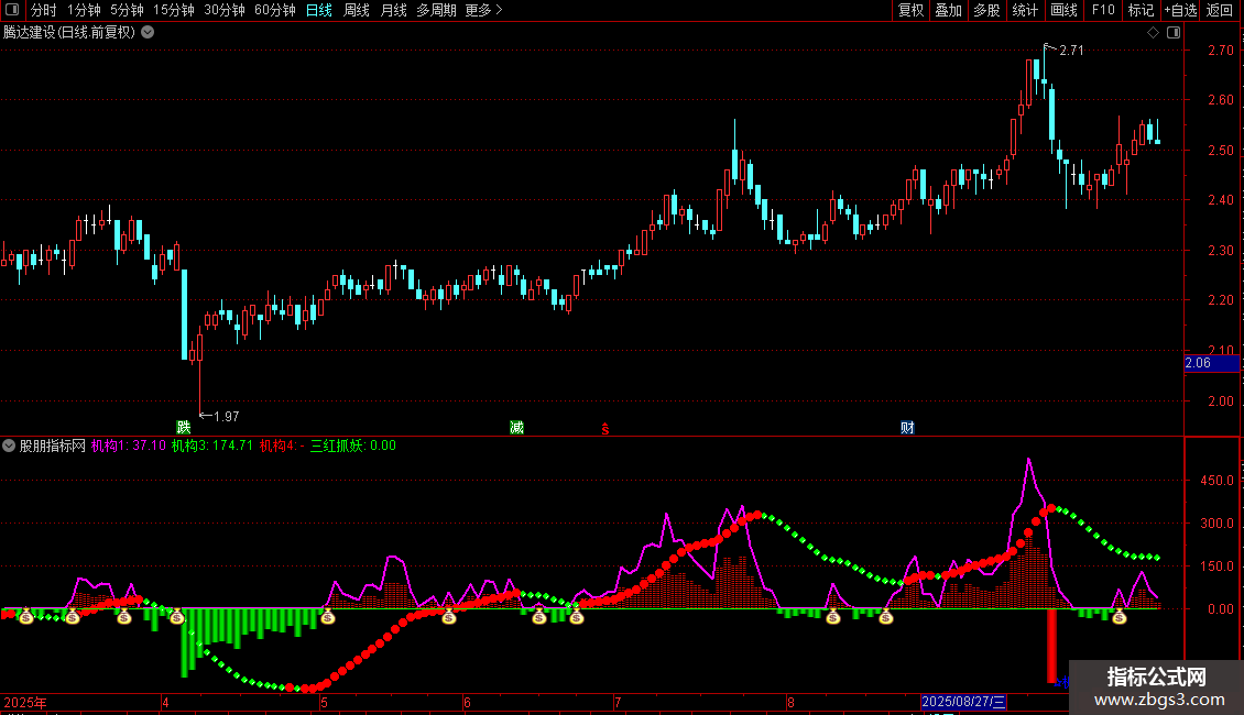 2. 机构2线(红绿柱):实时显示短期资金强度