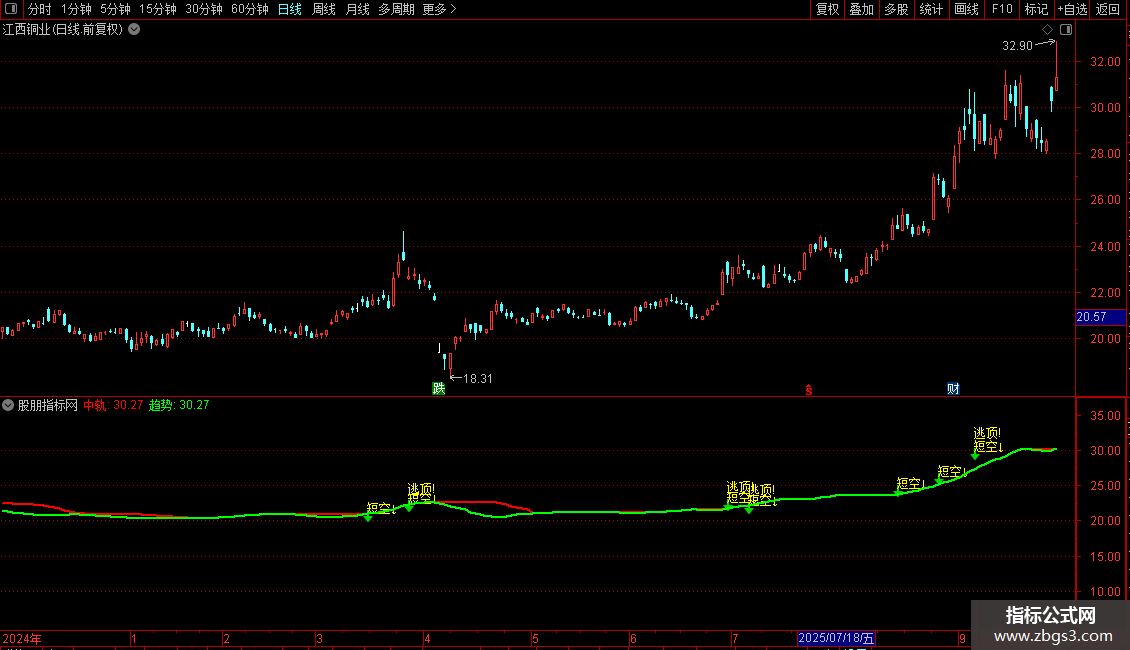 中轨:HHV(MA(H,13),13),COLORRED,LINETHICK2;