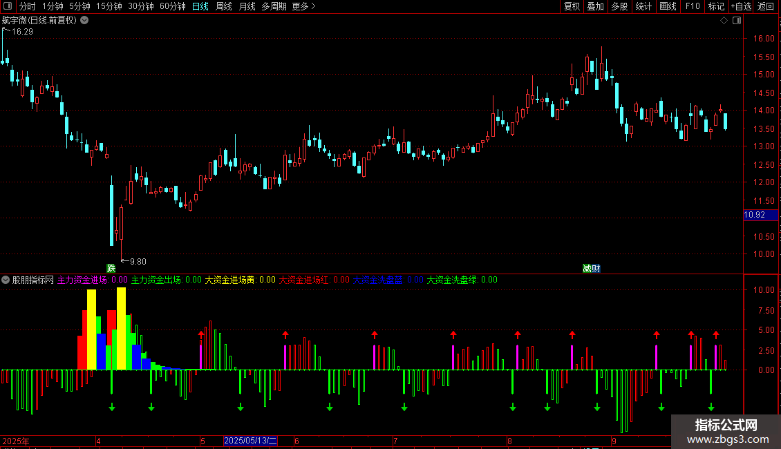 主力资金进场:IF(CROSS(AA,BB),3,0),STICK,LINETHICK3,COLORFF00FF;
