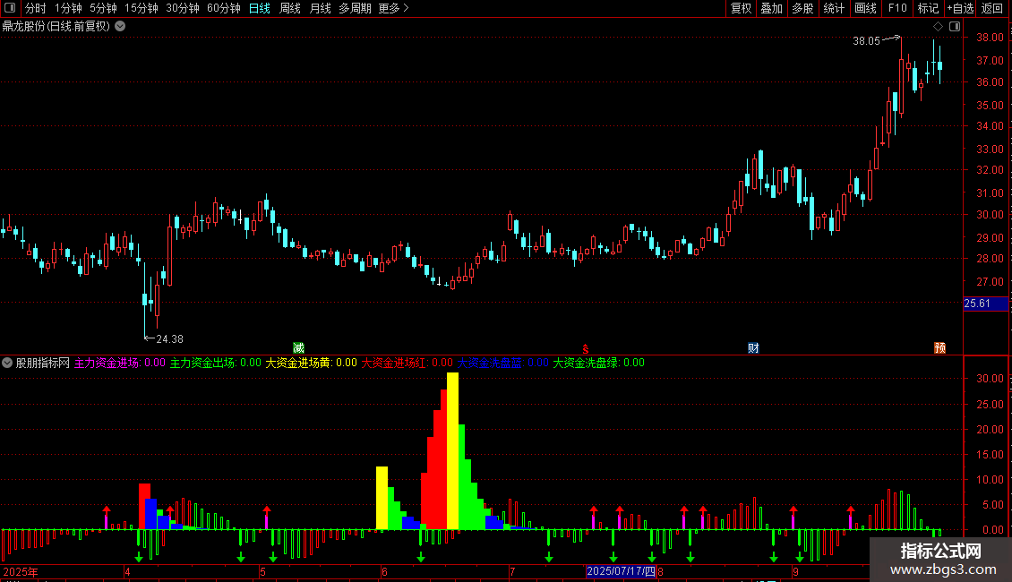 洗盘:STICKLINE(VAR5<REF(VAR5,1),0,VAR5,7,0),COLORGREEN; 主力进场阳:STICKLINE(VAR5>REF(VAR5,1) AND C>O,0,VAR5,7,0 ),COLORYELLOW;