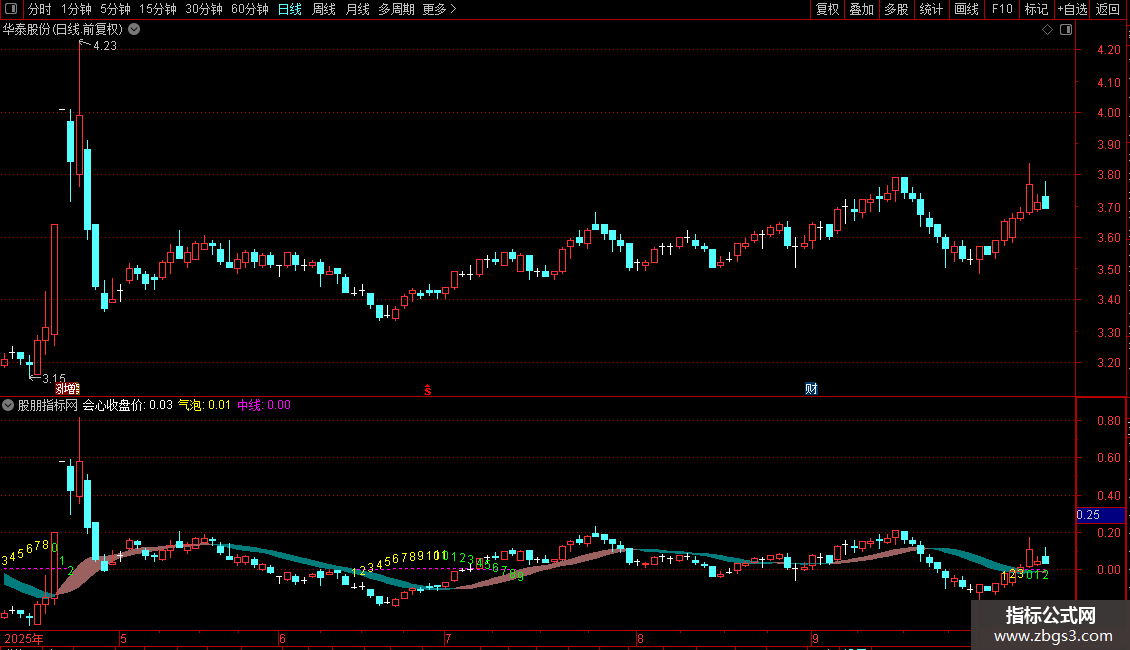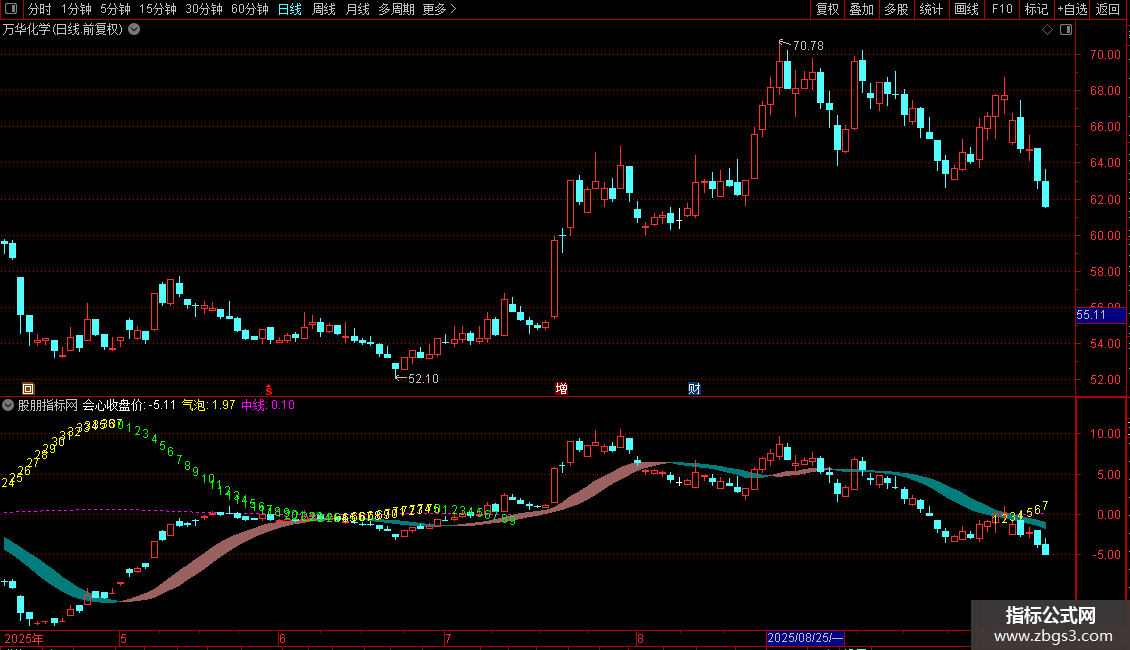 VAR1Z:=REF(MA(C,20),10);开:=O-VAR1Z,NODRAW;高:=H-VAR1Z,NODRAW;低:=L-VAR1Z,NODRAW;会心收盘价:C-VAR1Z,NODRAW;MID:=(3*会心收盘价+低+开+高)/6;红线:=(20*MID+19*REF(MID,1)+18*REF(MID,2)+17*REF(MID,3)+16*REF(MID,4)+15*REF(MID,5)+14*REF(MID,6)+13*REF(MID,7)+12*REF(MID,8)+11*REF(MID,9)+10*REF(MID,10)+9*REF(MID,11)+8*REF(MID,12)+7*REF(MID,13)+6*REF(MID,14)+5*REF(MID,15)+4*REF(MID,16)+3*REF(MID,17)+2*REF(MID,18)+REF(MID,20))/210,COLORLIRED;绿线:=MA(红线,6),COLORLIGREEN;X1:=ABS(红线)/0.9,COLORBROWN;气泡:IF(红线<=0,X1,DRAWNULL),COLORYELLOW,NODRAW;中线:IF(红线<0,(X1+红线)/2,DRAWNULL),COLORMAGENTA,DOTLINE;DRAWBAND(绿线,RGB(0,124,124),红线,RGB(155,96,96));DRAWKLINE(高,开,低,会心收盘价);ZP:=红线<=0 AND 气泡>REF(气泡,1);天数:DRAWNUMBER(ZP,气泡,BARSLAST(REF(红线,1)>0 AND 红线<0)),COLORYELLOW;ZP1:=红线<=0 AND 气泡<REF(气泡,1);天数1:DRAWNUMBER(ZP1,气泡,BARSLAST(REF(气泡>REF(气泡,1),1) AND 气泡<REF(气泡,1))),COLORGREEN;