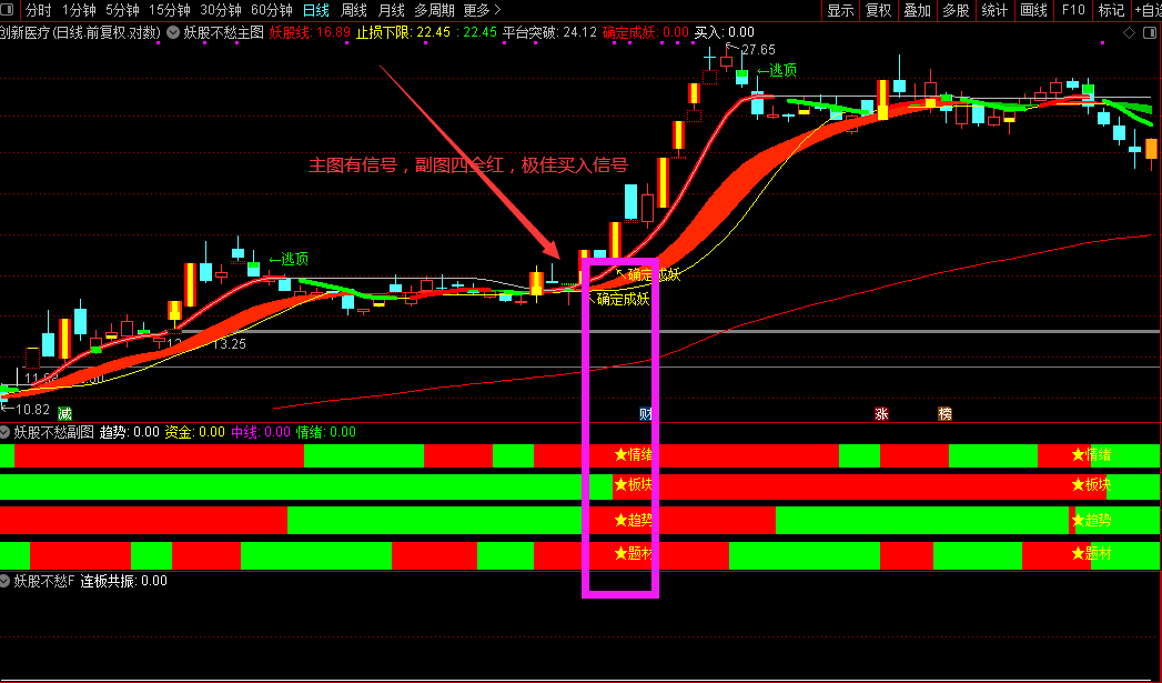 2、通过情绪+板块+趋势+题材四维共振,这类信号较多,配合主图信号,出票信号适中几乎每个行情都能捕捉到大妖股。
