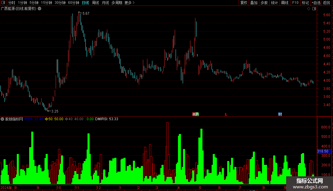 使用方法:建议结合柱体高度与面积进行综合判断。当红柱持续放大且RSI线处于中轴50上方时,可视为较为可靠的多头信号;当绿柱显著扩张并压制红柱,同时RSI线走弱,则可能预示空头行情来临。此指标尤其适用于捕捉短期趋势的转折点。