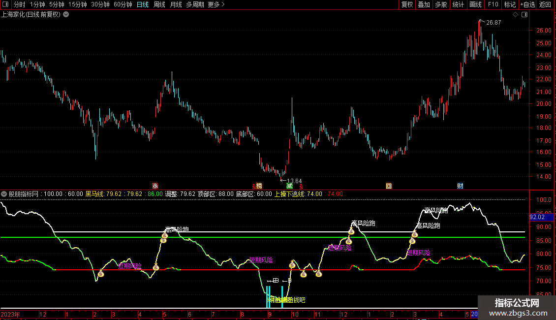 DRAWTEXT(VAR9 AND VAR7<88,调整,'短期风险'),COLORF00FF0;