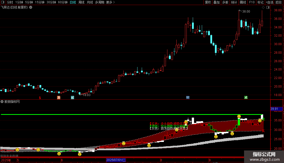 G0赋值:(最高价的25日偏移移动平均的25日偏移移动平均-最低价的25日偏移移动平均的25日偏移移动平均)*1+最高价的25日偏移移动平均的25日偏移移动平均,线宽为1,画白色