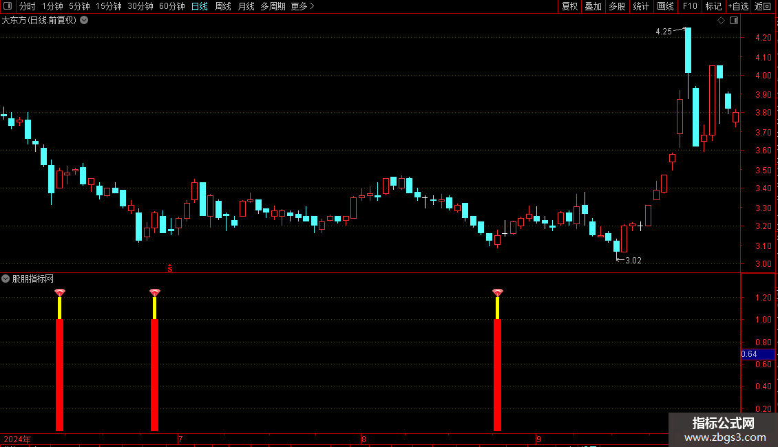 注:指标通过叠加短、中、长周期超卖状态,避免单一周期误判;黄色柱体为初步警示,红色柱体+三角图标为确认信号,建议结合日线成交量及板块效应验证。
