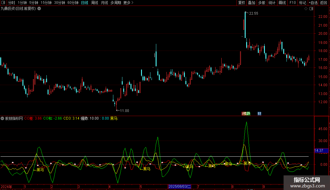CO和:MA(REF(CJD+OJD,1),3),COLORGREEN;