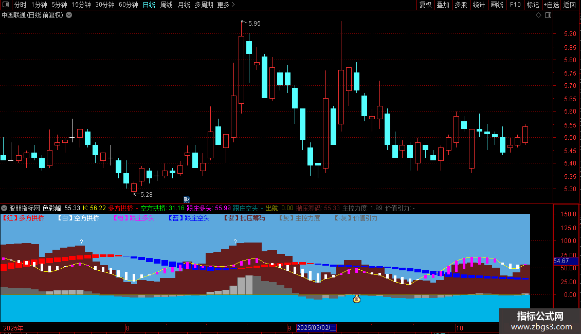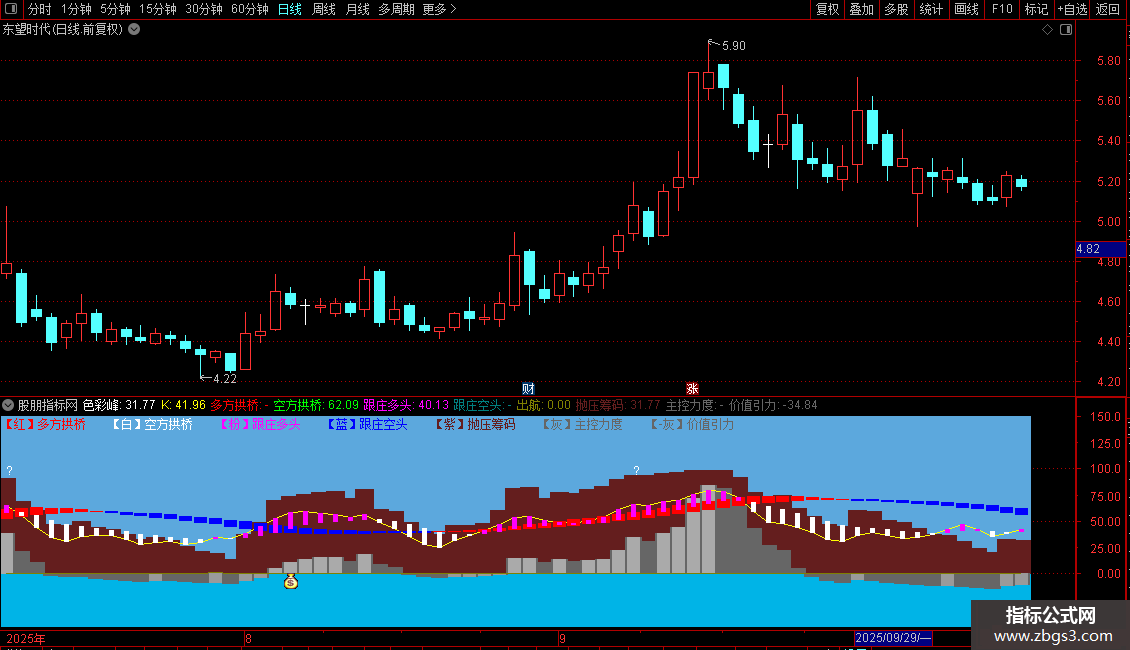跟庄空头:IF(K<=D,D,DRAWNULL),NODRAW,COLORLICYAN;