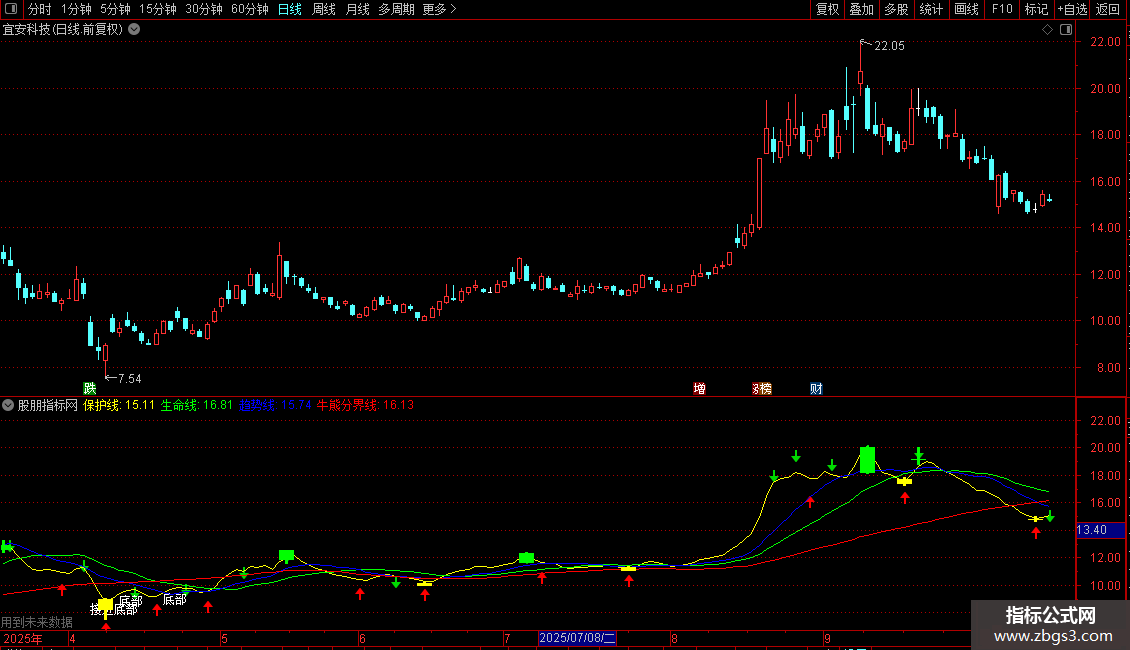 DRAWICON((ZIG(3,5)>REF(ZIG(3,5),1)) AND (REF(ZIG(3,5),1)<=REF(ZIG(3,5),2)) AND (REF(ZIG(3,5),2)<=REF(ZIG(3,5),3)),LOW*0.98,1) ;DRAWICON((ZIG(3,5)<REF(ZIG(3,5),1)) AND (REF(ZIG(3,5),1)>=REF(ZIG(3,5),2)) AND (REF(ZIG(3,5),2)>=REF(ZIG(3,5),3)),HIGH*1.01,2);VAR3:=(CLOSE-MA(CLOSE,6))/MA(CLOSE,6)*100;VAR4:=(CLOSE-MA(CLOSE,24))/MA(CLOSE,24)*100;VAR5:=(CLOSE-MA(CLOSE,32))/MA(CLOSE,32)*100;VAR6:=(VAR3+VAR4+VAR5)/3;VAR7:=EMA(VAR6,5);ZB:=EMA(EMA(VAR3,5),5)*3, COLORSTICK;VAR8:=IF(VAR6<=-20,10,0);VAR9:=HHV(VAR8,10);VARA:=IF(VAR9 AND CROSS(MA(CLOSE,3),MA(CLOSE,5)),20,0);K:=EMA(VAR7,5)*2, , COLORFF00FF;D:=EMA(K,5), , colorwhite;J:=K*3-D*2, ,coloryellow;VARB:=BETWEEN(CLOSE,MA(CLOSE,3),MA(CLOSE,5)) AND J>10;HS:=VOL/CAPITAL*100, , colorgreen;DRAWTEXT(VAR8=10 AND FILTER(VAR8=10,5),LOW*0.93,'接近底部');DRAWTEXT(VARA=20,LOW*0.95,'底部');保护线:MA(C,3),coloryellow;生命线:MA(C,21),colorgreen;趋势线:MA(C,12),colorblue; 牛熊分界线:MA(C,55),colorred; VAR1:=ZIG(3,10)<REF(ZIG(3,10),1) AND REF(ZIG(3,10),1)>REF(ZIG(3,10),2); VAR2:=ZIG(3,10)>REF(ZIG(3,10),1) AND REF(ZIG(3,10),1)<REF(ZIG(3,10),2);STICKLINE(VAR1,C,O,8,0),colorgreen,LINETHICK2;STICKLINE(VAR1,C,O,3,0),colorgreen,LINETHICK2; STICKLINE(VAR1,H,L,1,0),colorgreen,LINETHICK2; STICKLINE(VAR2,C,O,8,0),coloryellow,LINETHICK2; STICKLINE(VAR2,C,O,3,0),coloryellow,LINETHICK2; STICKLINE(VAR2,H,L,1,0),coloryellow,LINETHICK2;