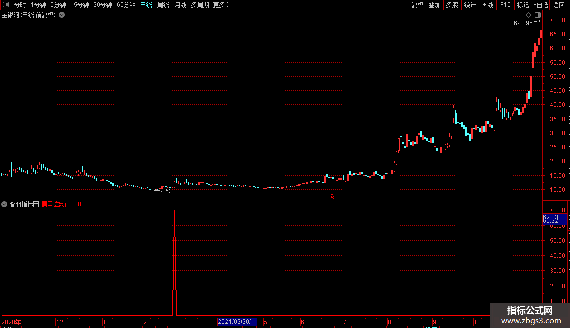 黑马启动:IF(CROSS(行情线,中线止损线) AND C/REF(C,1)>1+0.01*C AND 中线止损线<长线止损线,70,0),COLORRED,LINETHICK2;