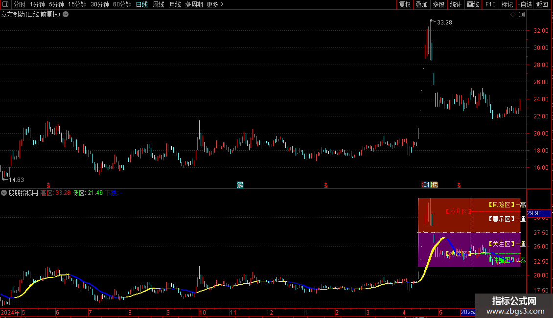 DRAWTEXT(CURRBARSCOUNT=N11/4+5,GD-KJ*0.09,'【风险区】--高抛避险'),COLOR00FFFF;