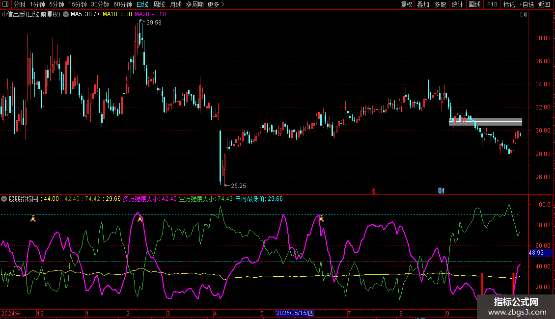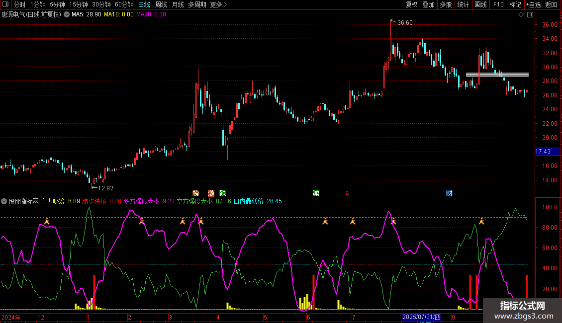 2.紫色主力吸筹线低位震荡配合红色量能柱出现,构成日内见底信号,此时适合分批低吸布局。
