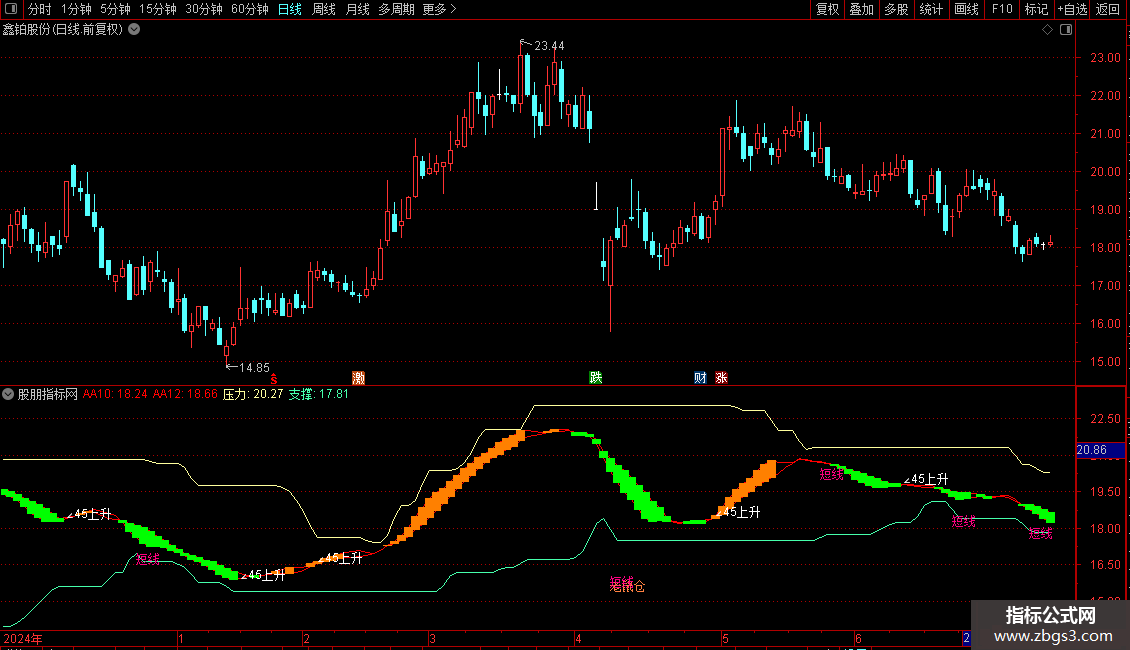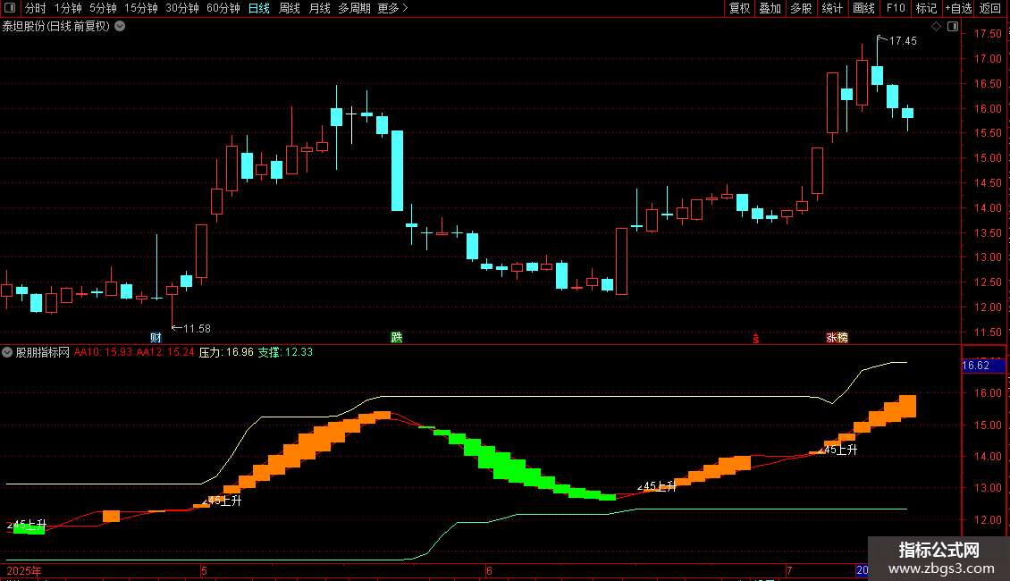 EMA8,'∠45上升'),COLORWHITE;压力:MA(REF(HHV(C,30),1),2),COLOR9DFFFF;