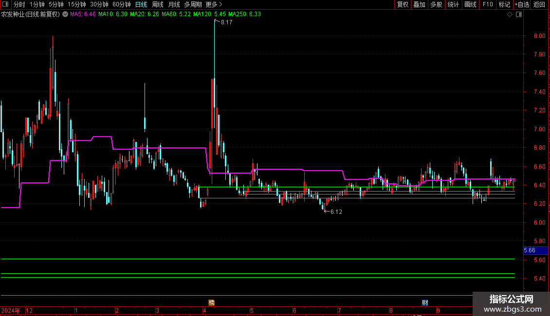 图中每条线都是压力线,相反每一条也是支撑线。指标在沙盘推演中,可以看到股价在一些压力点附近来回震荡,下跌过程中绿线成为支撑点,上涨过程中绿线就成了压力点。