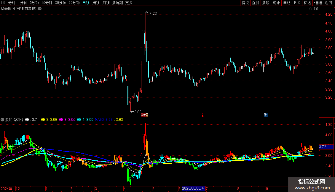 把BBI指标的参数做一些修改,加入三条线:BBI2、BBI3、BBI4。