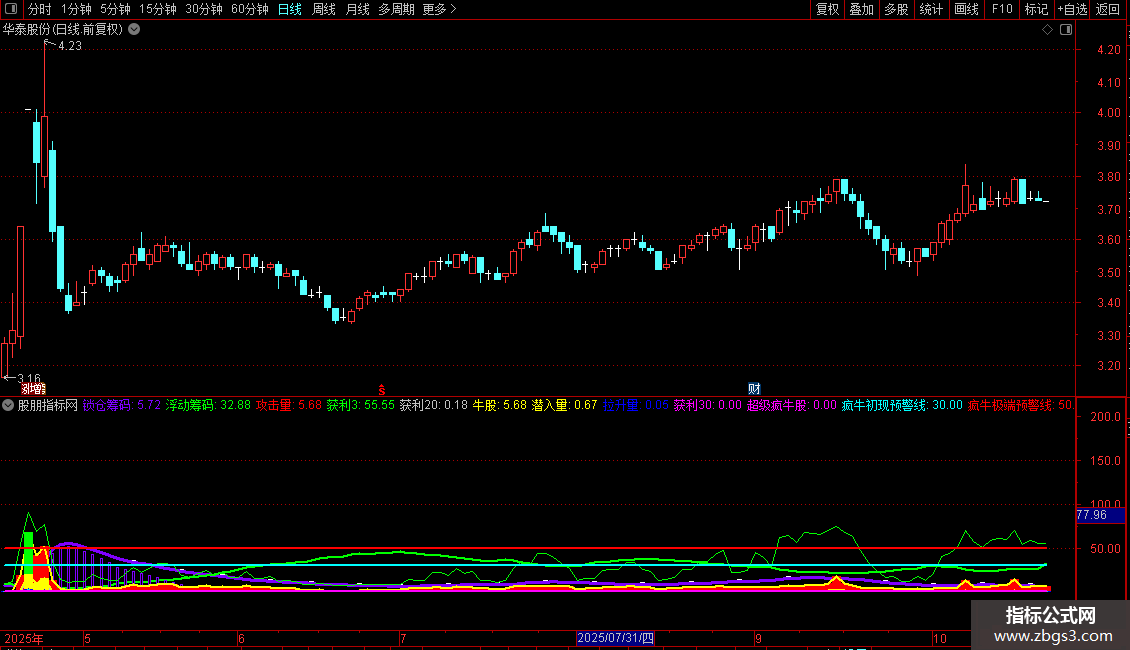 当满足条件获利30>20时,在超级疯牛股和0位置之间画柱状线,宽度为3.5,0不为0则画空心柱.,COLORFF00FF,线宽为3