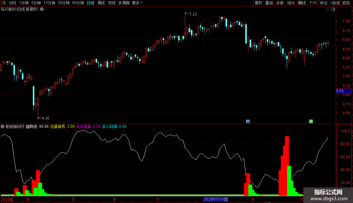 买入时间: IF(CROSS(趋势线,见底信号),100,0),COLORCYAN,LINETHICK4;