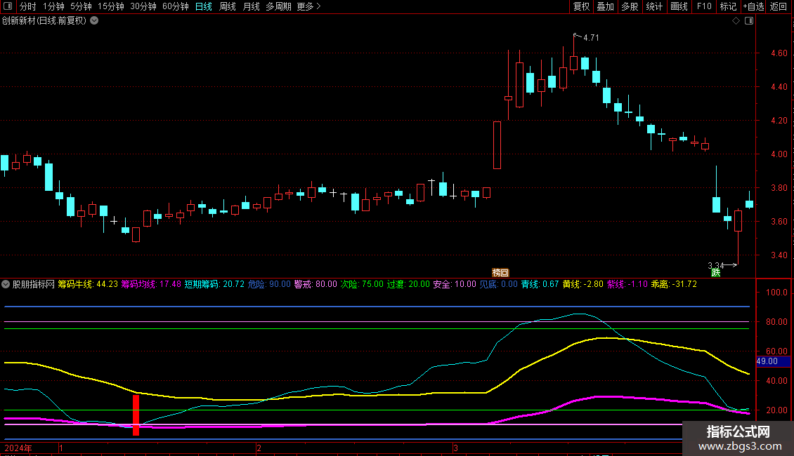 筹码均线:SMA(ZBGS6,5,1)*ZBGS3,COLORMAGENTA,LINETHICK3;