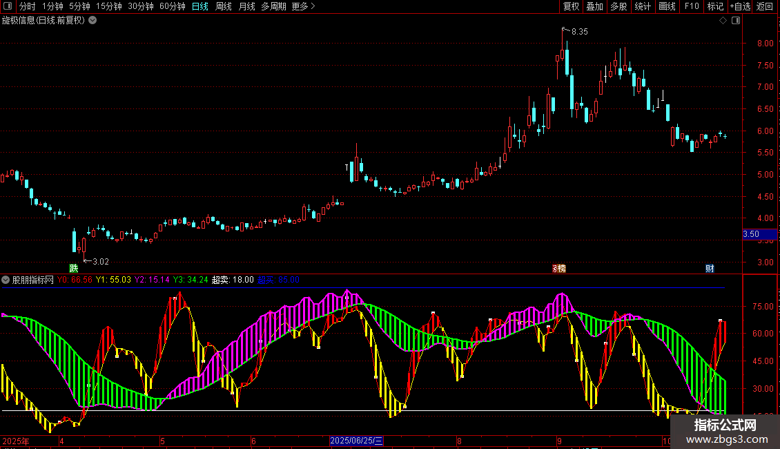 {粉红色柱子为主力控盘资金,粉红色柱子出现说明主力开始进场,粉红色柱子消失,说明主力出货完毕,粉红色柱子由长变短,说明主力小出货!}