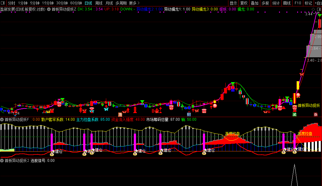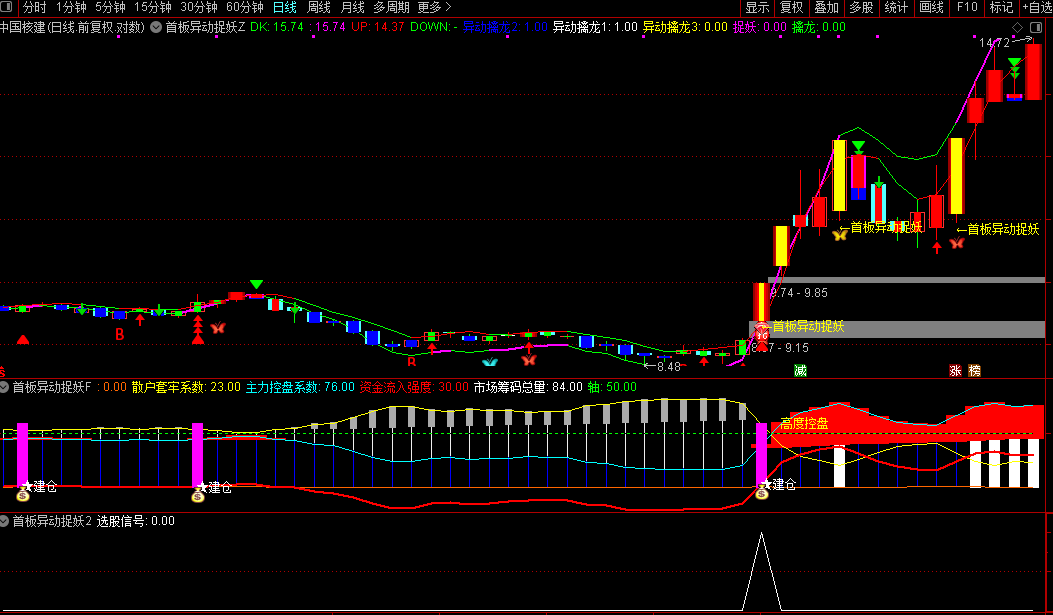 本指标名为“首板异动捉妖套装指标公式”,旨在通过价格异动、筹码分布、均线趋势等多维度条件,捕捉短线强势股的启动信号。