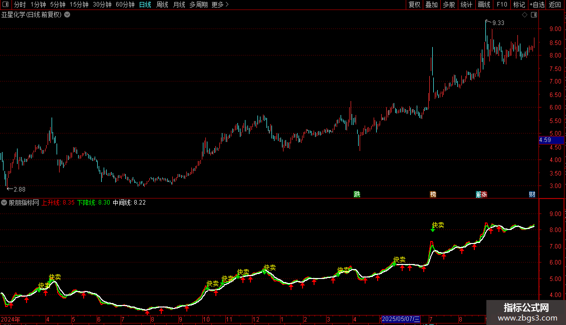 上升线:EMA(C,3),COLORRED,LINETHICK2;