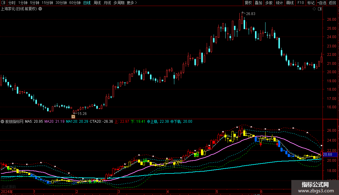 上:MA20+2*STD(CLOSE,20),COLOR0000FF,DOTLINE;