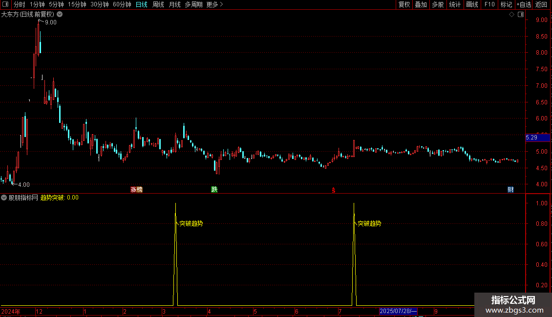 当满足条件趋势突破时,在0.8位置书写文字,画黄色
