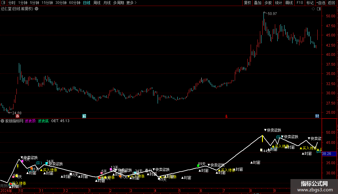 当满足条件VAR51=33时,在最高价*1.06位置书写文字,画白色