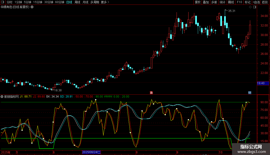 SD: EMA(0.667*REF(SK,1)+0.333*SK,1),COLORCYAN;