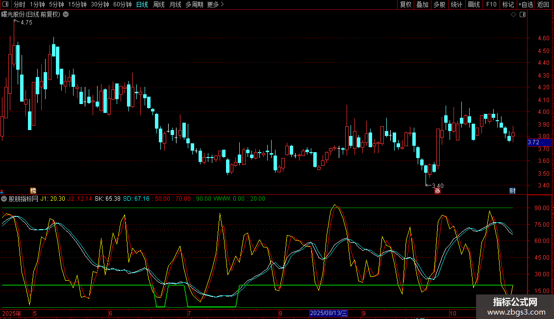 输出SD: 0.667*1日前的SK+0.333*SK的1日指数移动平均,画青色