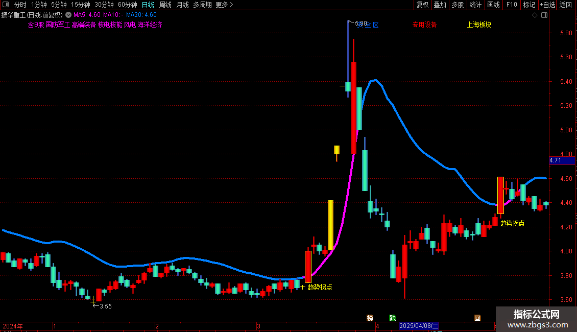 使用该指标时,可遵循以下要点:当趋势线由蓝转紫且股价上穿趋势线时,可视为买入信号;当出现“趋势拐点”提示并伴随放量,往往是加仓时机;而当趋势线由紫转蓝且股价跌破趋势线时,则应考虑卖出或减仓。