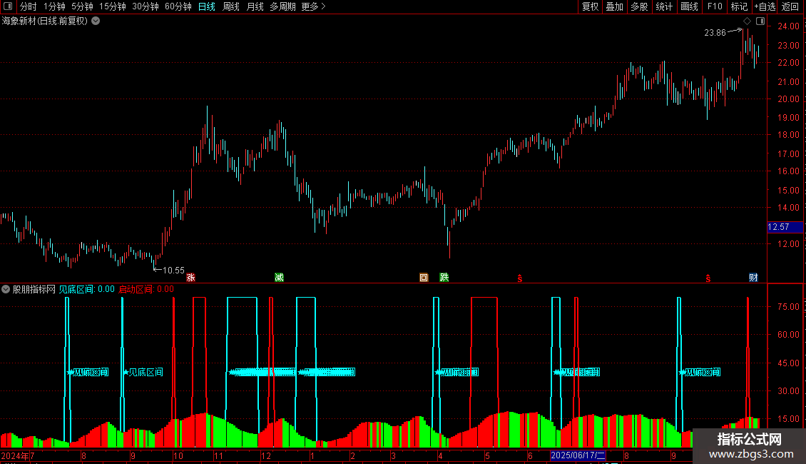 指标通过计算价格在近期高低点之间的相对位置,判断股票的底部和启动信号。主要功能是识别两种关键时机:当股价长期弱势后出现企稳迹象时标记为“见底区间”;当股价连续走强且动量充足时标记为“启动区间”。操作策略是在见底区间关注潜在反转机会,在启动区间考虑跟进。