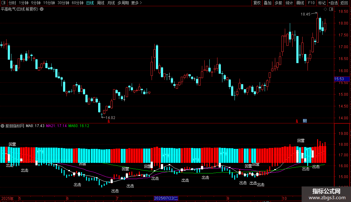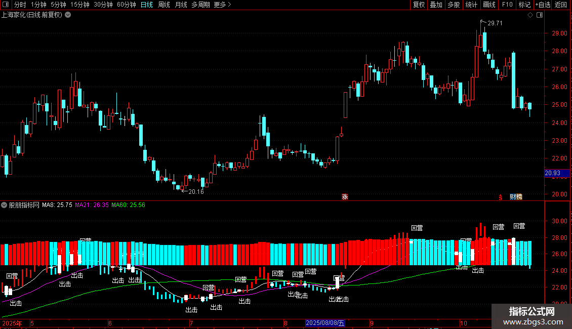MA8:MA(CLOSE,8),COLORWHITE,LINETHICK1; MA21:MA (CLOSE,21),COLORMAGENTA,LINETHICK1; MA60:MA(CLOSE,60),COLORGREEN,LINETHICK1; 买线:=EMA (C,2); 卖线:=EMA(SLOPE(C,8)*1+C,8); BUY1:=CROSS(买线,卖线); SEL:=CROSS(卖线,买线);DRAWTEXT(BUY1,LOW*0.95,'出击'),COLORWHITE,LINETHICK5; DRAWTEXT (SEL,HIGH*1.05,'回营'),COLORWHITE,LINETHICK5; STICKLINE(买线>=卖线,LOW,HIGH,0.1,0),COLORRED ; STICKLINE(买线>=卖线,CLOSE,OPEN,3,3),COLORRED ; STICKLINE(买线<卖线,CLOSE,OPEN,3,3),COLORCYAN; STICKLINE(买线<卖线,LOW,HIGH,0.1,0),COLORCYAN; STICKLINE(CROSS(买线,卖线) OR CROSS(卖线,买线),OPEN,CLOSE,2.5,0),COLORWHITE;