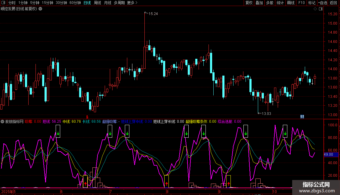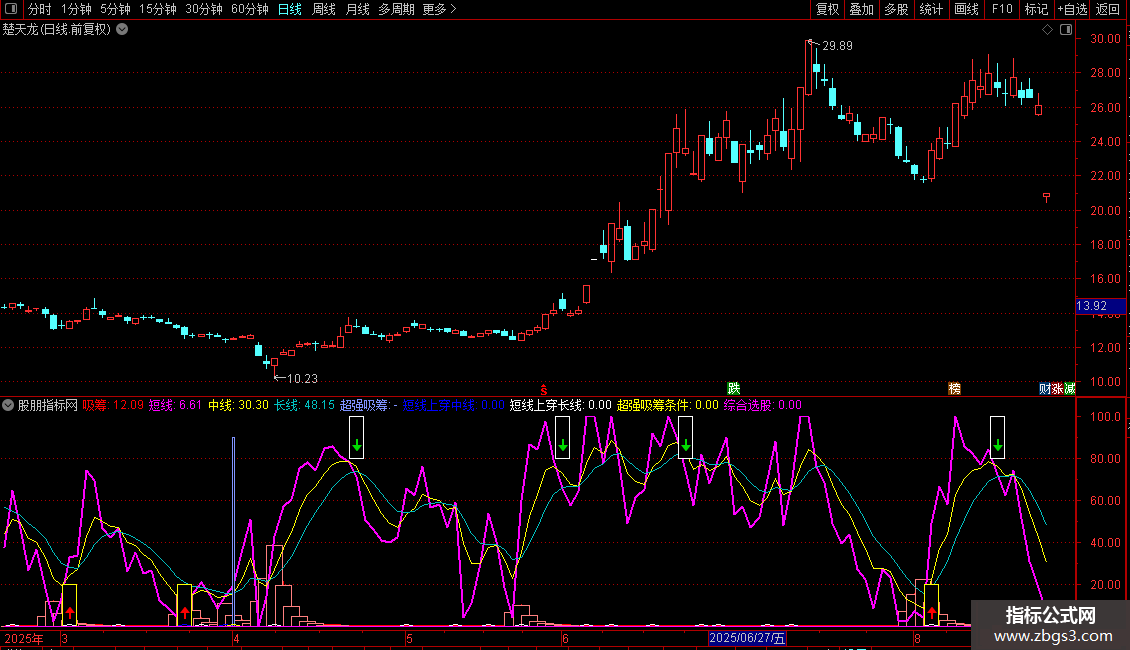指标是一个多周期动能分析工具,主要功能是捕捉股票短期、中期、长期的动能变化,并结合“吸筹”信号辅助判断主力资金动向。其核心操作策略是:当短期动能线上穿中期线且“吸筹”指标显示主力资金介入时,视为买入信号;当短期线下穿中期线且动能处于高位时,视为卖出信号。指标还通过“超强吸筹”条件(如中期线上穿长期线且处于低位)强化底部确认,提高信号可靠性。