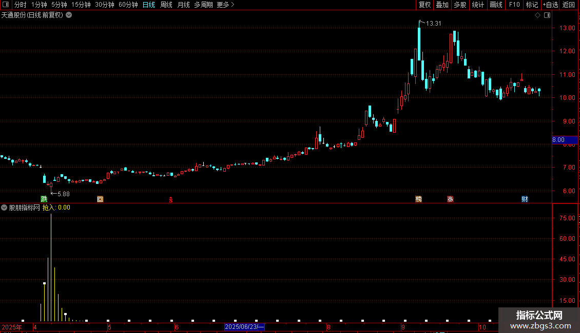 抢入:EMA(IF(LOW<=VARE,(VARD+VARF*2)/2,0),3)/618*VAR10,COLORYELLOW,STICK;