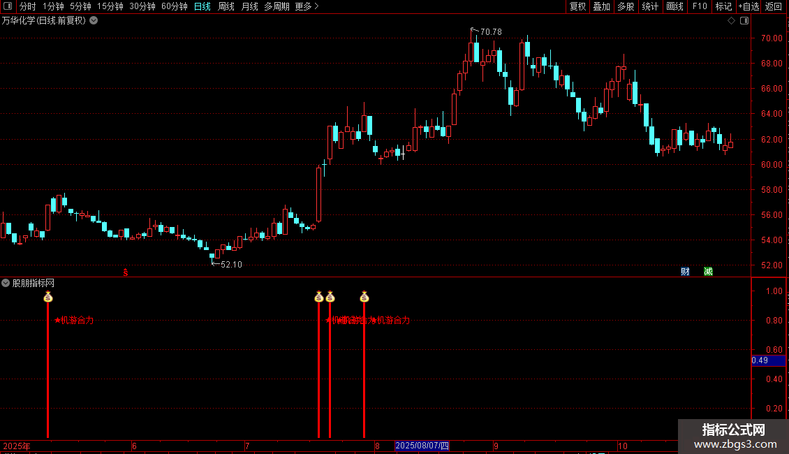 该指标通过多条件组合,主要关注以下情况:当股价突破关键均线(如13日均线)、MACD处于多头区域、成交量显著放大(如达到前一日2.7倍以上),且近期无大幅波动时,会触发“机游合力”信号;。此外,指标还包含对“龙头股”的识别,即当股价突破特定压力位或满足特定形态时,也可能触发信号;。操作上,当出现红色柱状信号或“★机游合力”文字提示时,可视为潜在买入时机;