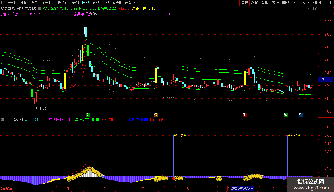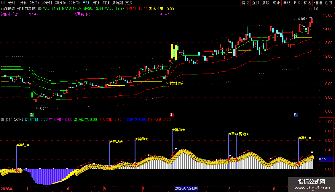 操作策略:当出现“★异动★”信号且MACD为正时,可考虑买入;当异动线显示空头回补或开始做空信号时,需警惕下跌风险。指标通过彩色柱状图直观展示多空区域,红色代表多头强势,绿色代表空头强势。